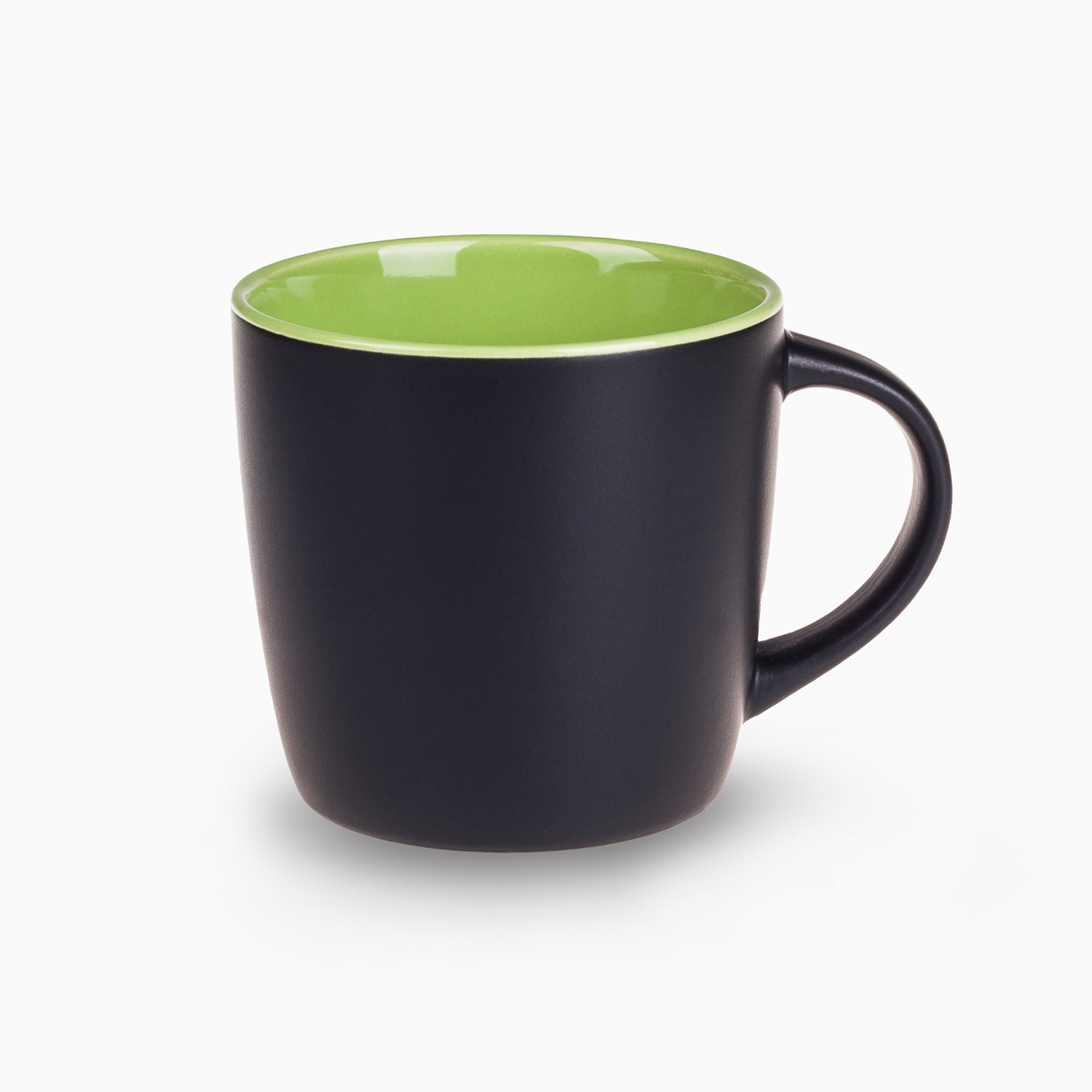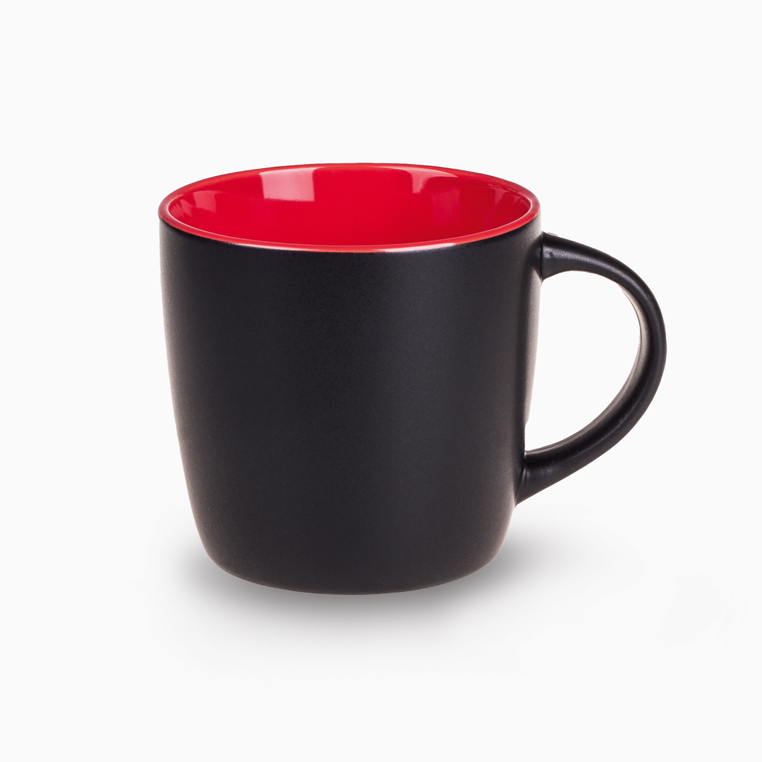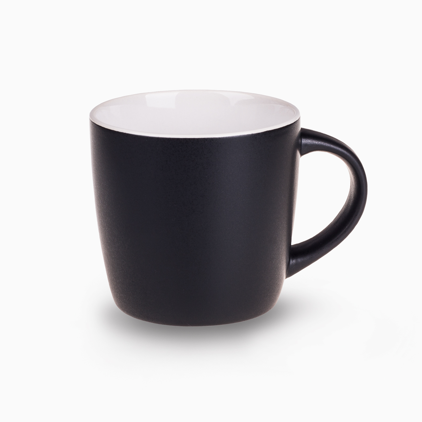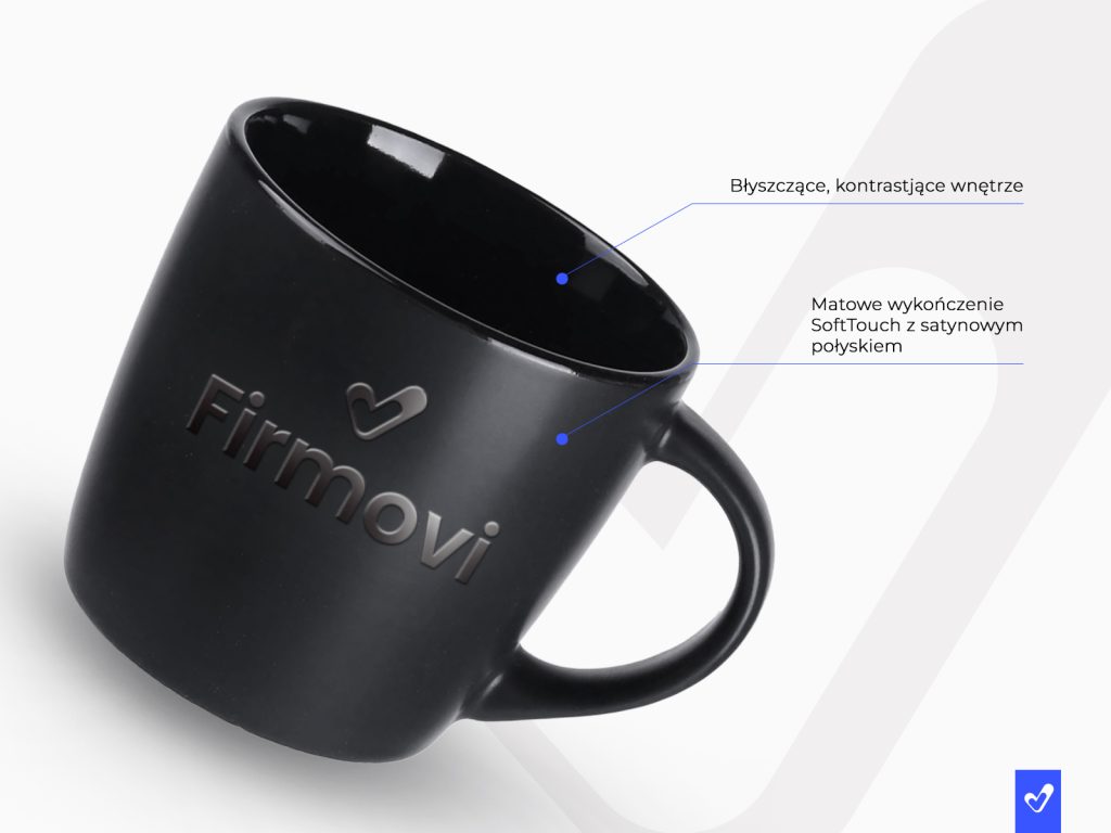 Praktyczny kubek z modnym matowym wykończeniem w czarnym kolorze. Posiada 7 odcieni kolorowego wnętrza do wyboru. Białe wnętrze można barwić na wybrany kolor z palety Pantone.