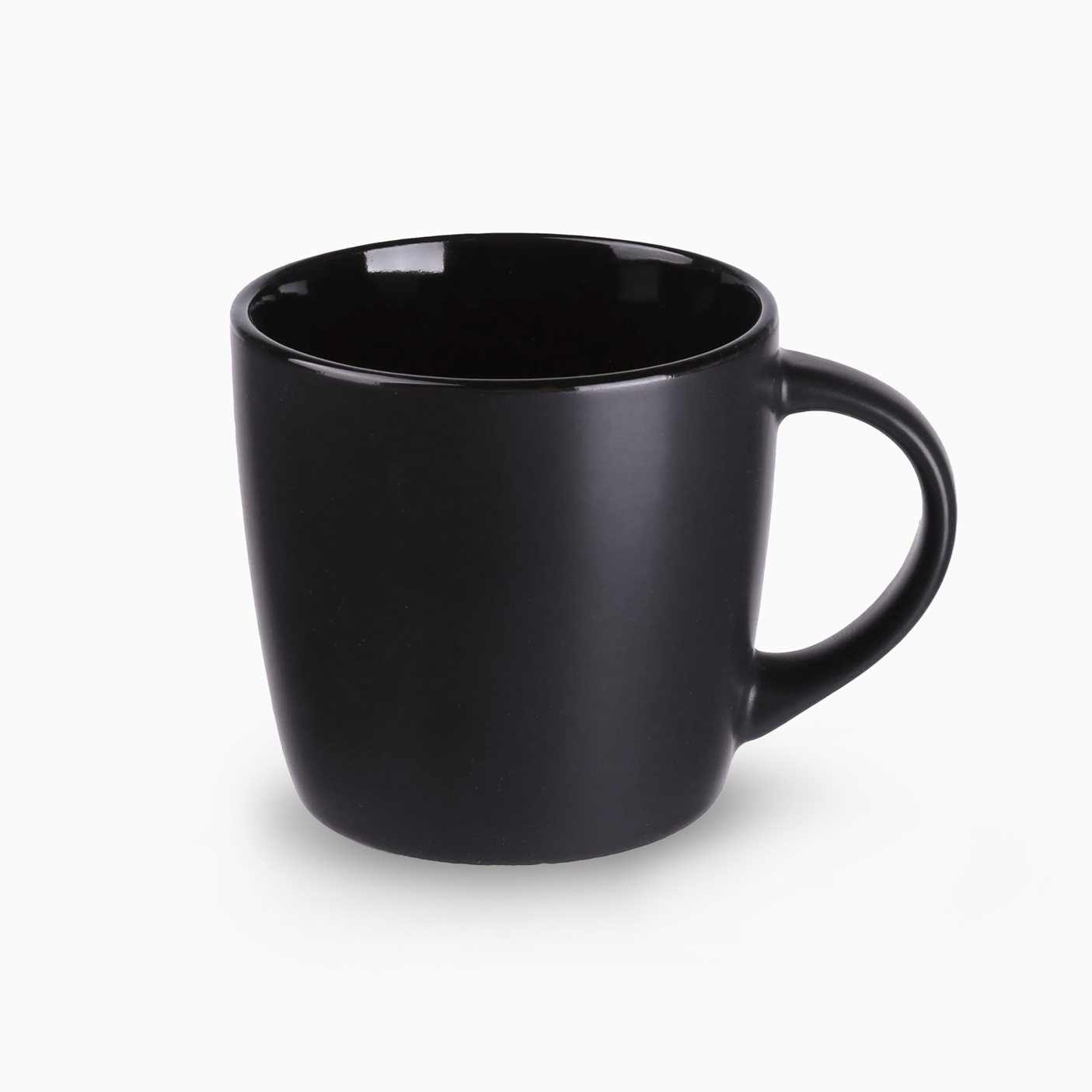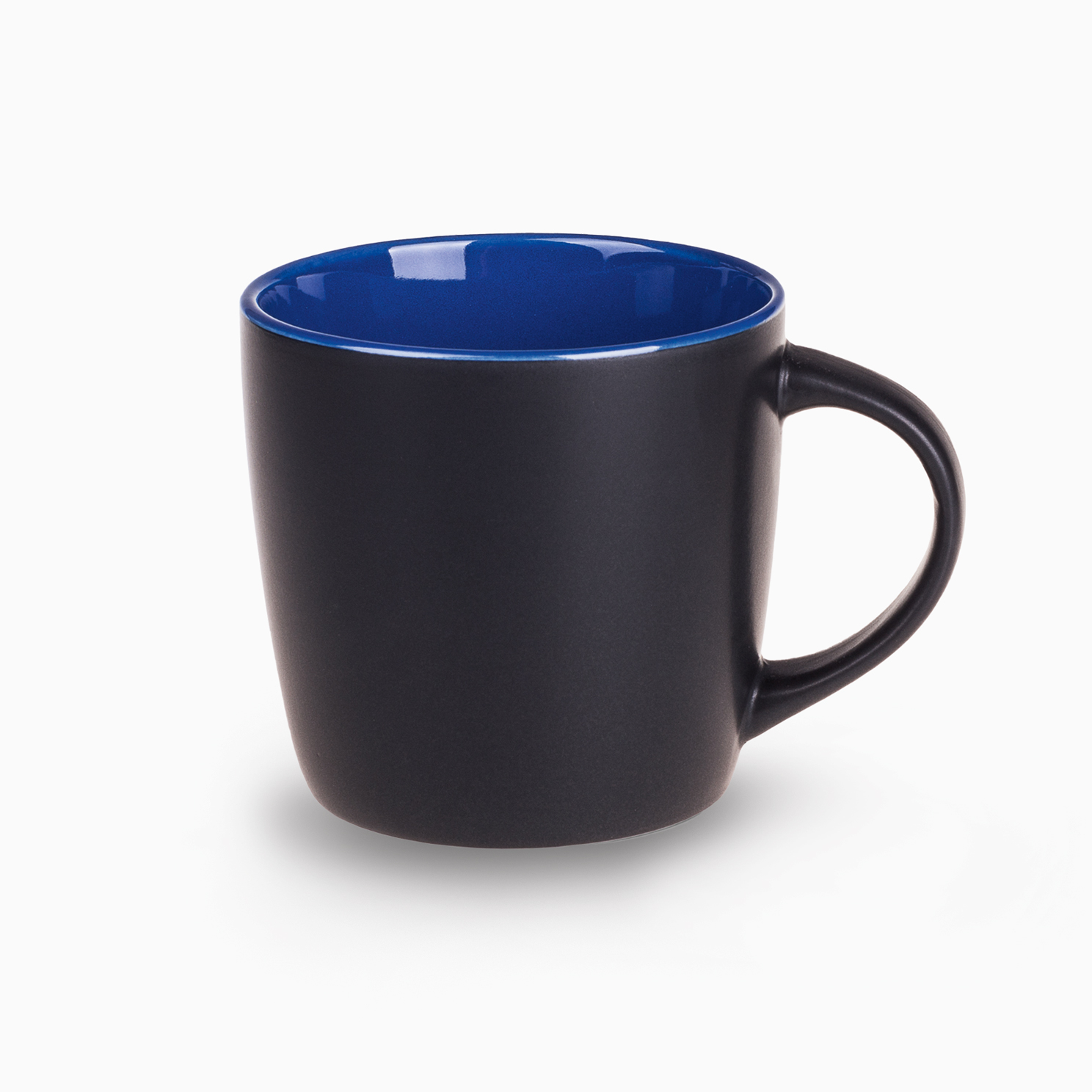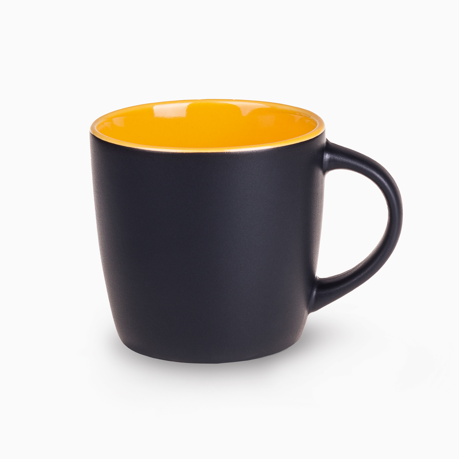 Praktyczny kubek z modnym matowym wykończeniem w czarnym kolorze. Posiada 7 odcieni kolorowego wnętrza do wyboru. Białe wnętrze można barwić na wybrany kolor z palety Pantone.